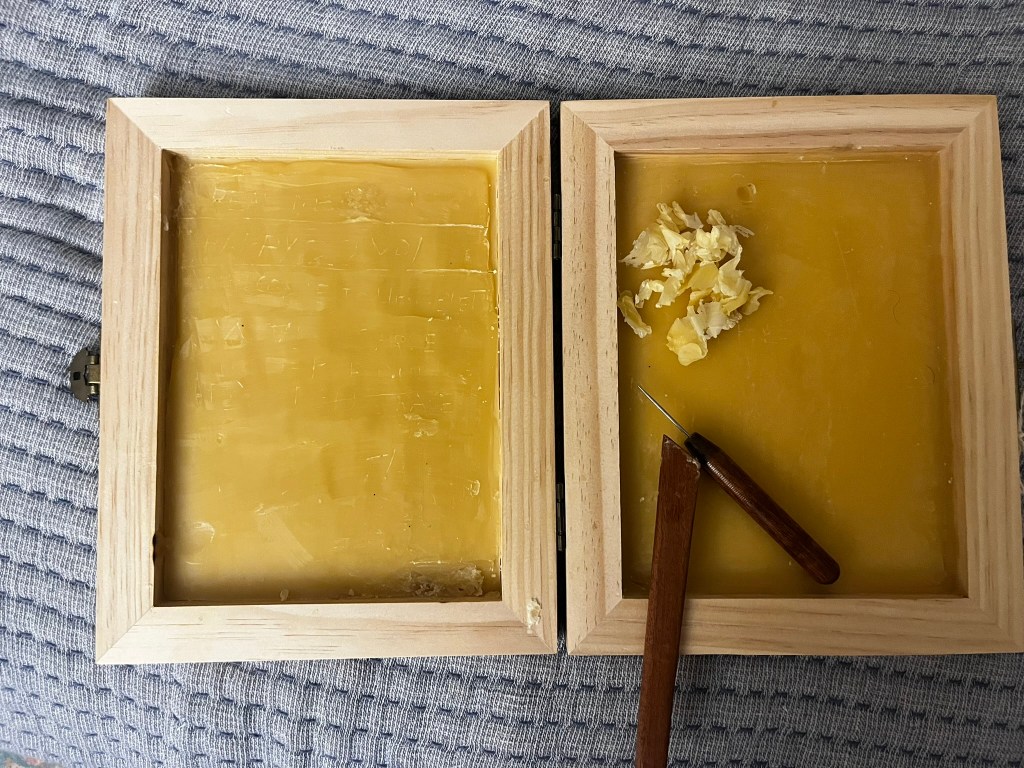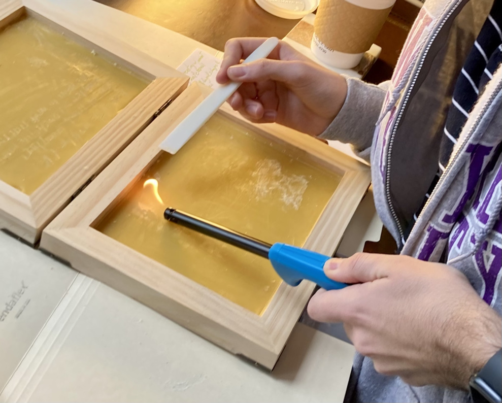 Once I had a smooth surface, I printed a to-scale lineart of one side of the original tablet and laid it directly over the clay. Using a potter’s knife, I cut around the outline to form a proper slab.