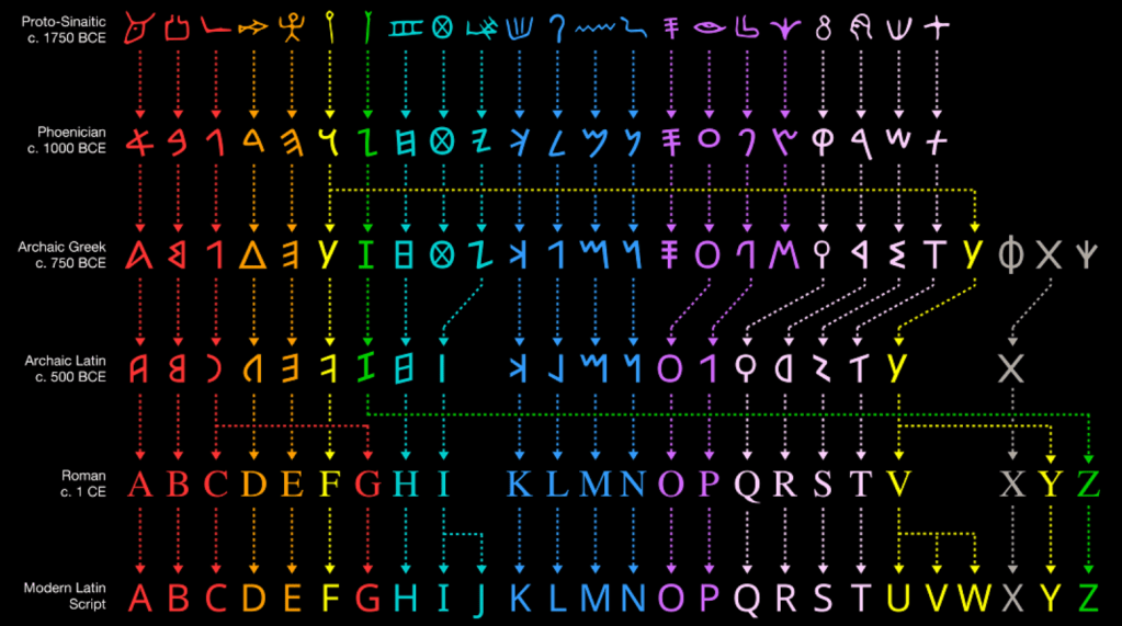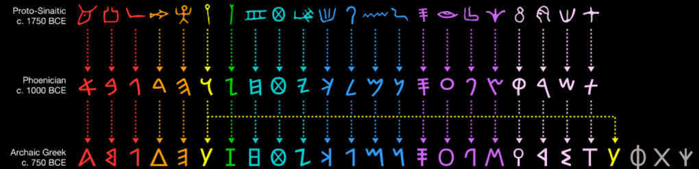 The evolution of our alphabet over the past ~3750 years. Note that symmetry only seems to increase, with only 7 of 26 characters not exhibiting either full or apparent symmetry. Note: I’m counting N and Z as “apparently symmetrical,” giving us 7 of 26 (27%) asymmetricals, a significantly lower amount than the 9 of 22 in Sinaitic (41%) and 10 of 26 (38%) in Archaic Greek.