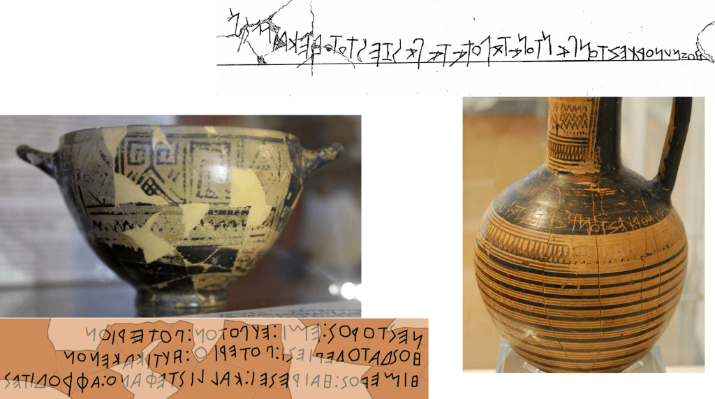 The two earliest known Greek inscriptions, both in verse. 1: Nestor’s Cup, Pithekoussai colonty (Ischia, in modern Italy). 2: Dipylon Inscription, Athens.