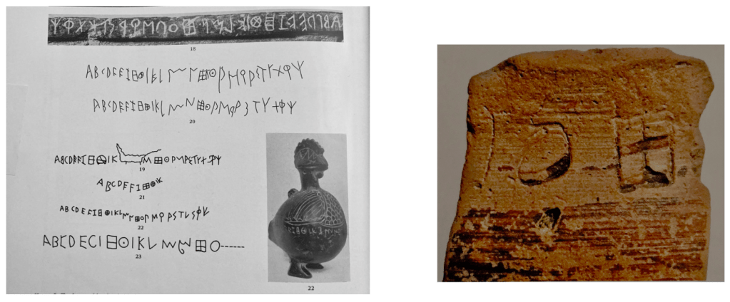 Abecedaries (an inscription where an alphabet is written out, rather than having lexical meaning) and fragments thereof found in sacred Greek and Etruscan contexts.