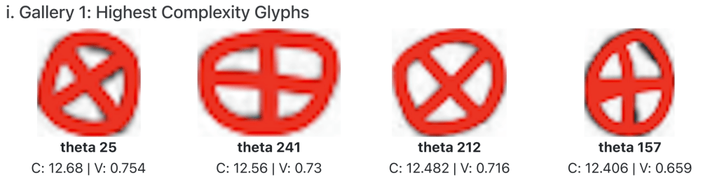 The twelve most complex glyphs in the Styra lead tablet dataset—all thetas. “C” denotes calculated complexity; “V” indicates vertical symmetry. For more context, see the abridged Styra dataset report.This gallery excludes thetas to give a fuller picture of complexity in the Styra cache.