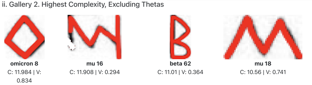 Note: this is emphatically a first draft. The weights are intuitive rather than statistically derived, and the model doesn’t yet differentiate between necessary complexity (as in psi or early mu) and anomalous embellishment. Still, it gives me a way to compare letters on a rough scale—from clean and minimal to dense and ornate. I’m also fortunately free of having to account for degree of serif, as this emerges much later and so is outside of my scope (at least for now), and I get the sense a computer would struggle to measure that feature.